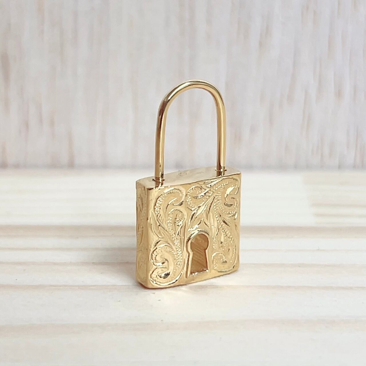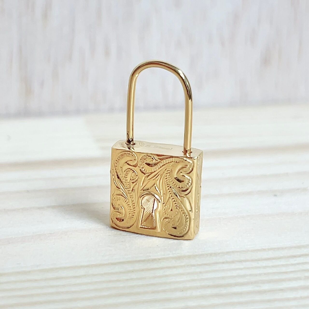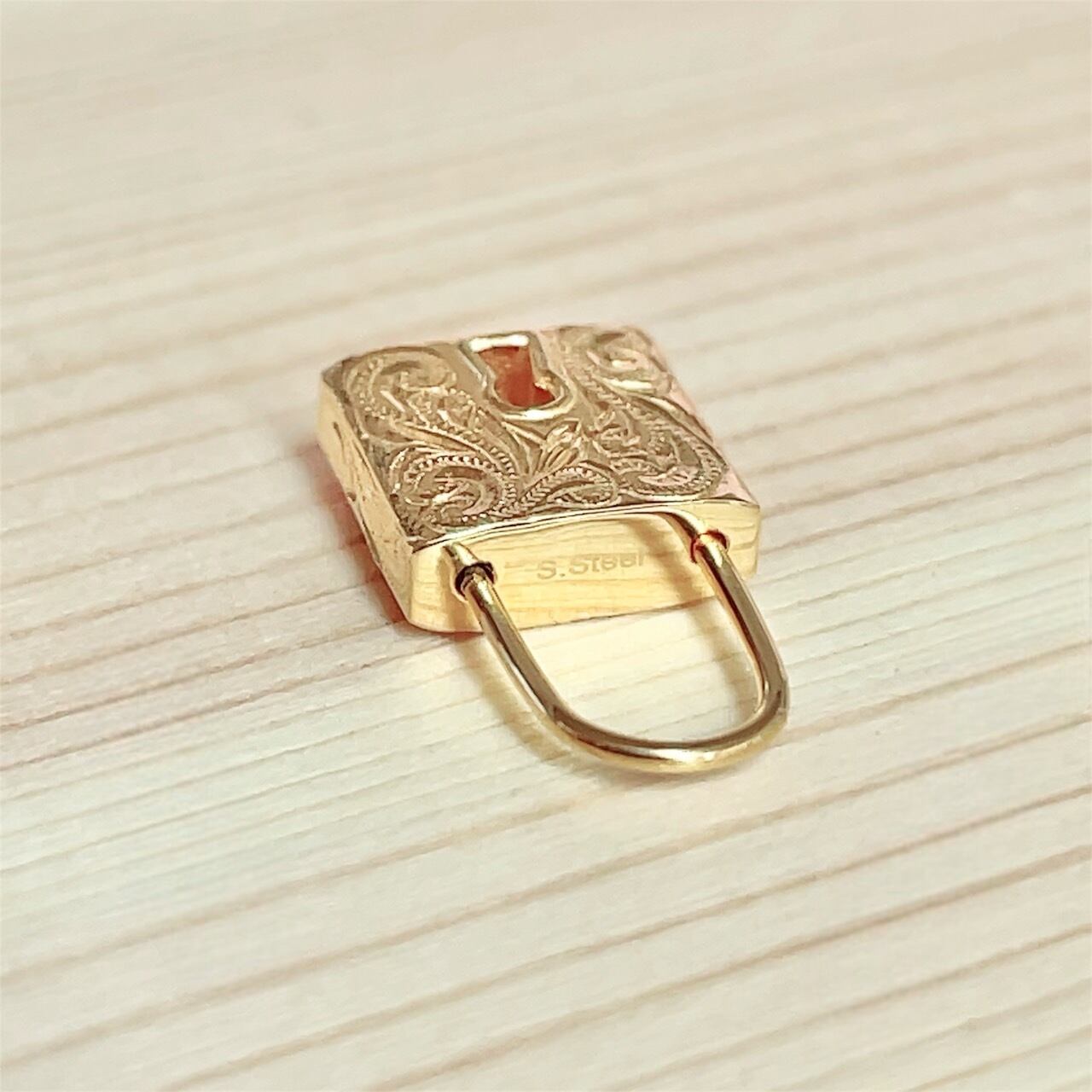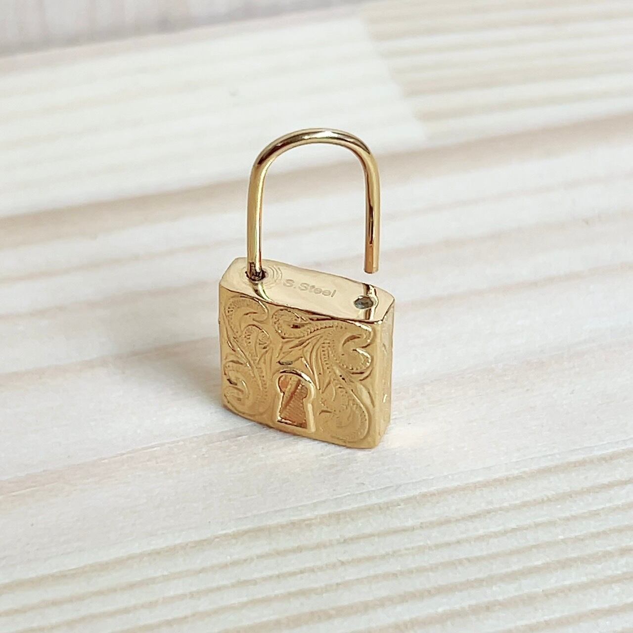 南京錠モチーフのパドロックピアスです。全体にはハワイアン柄のスクロールがほどこされており、ゴールドの色味がとても可愛くて存在感のあるピアスです。チェーンを通すことでペンダントトップとしてもお使いいただけます。