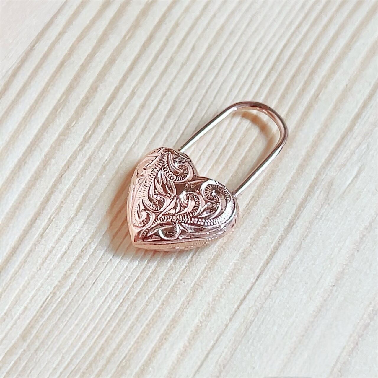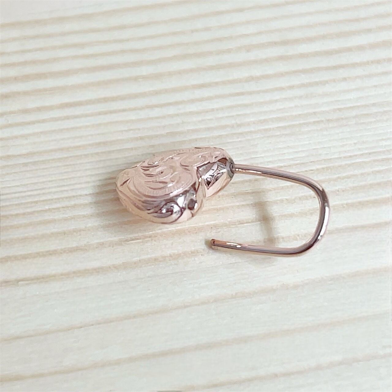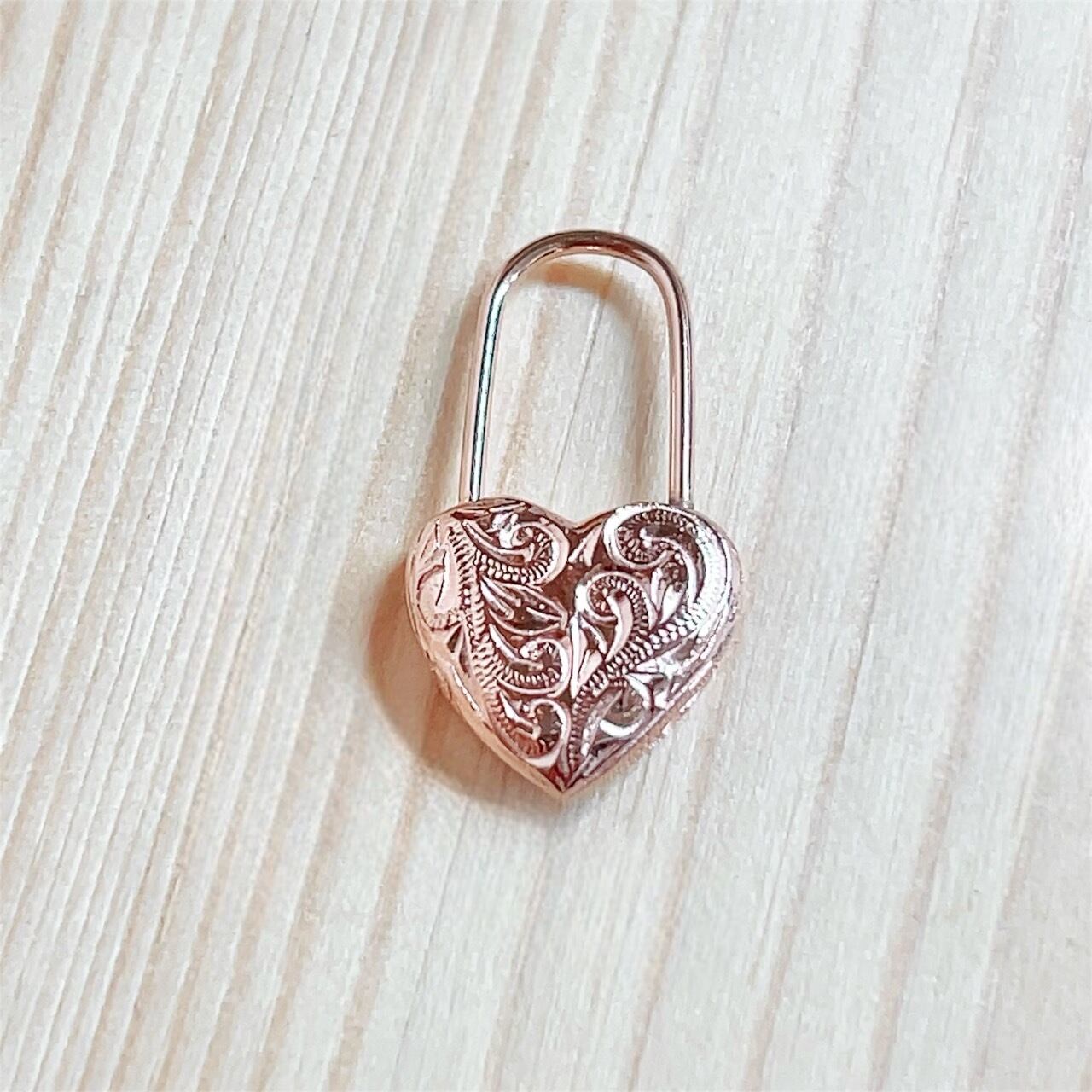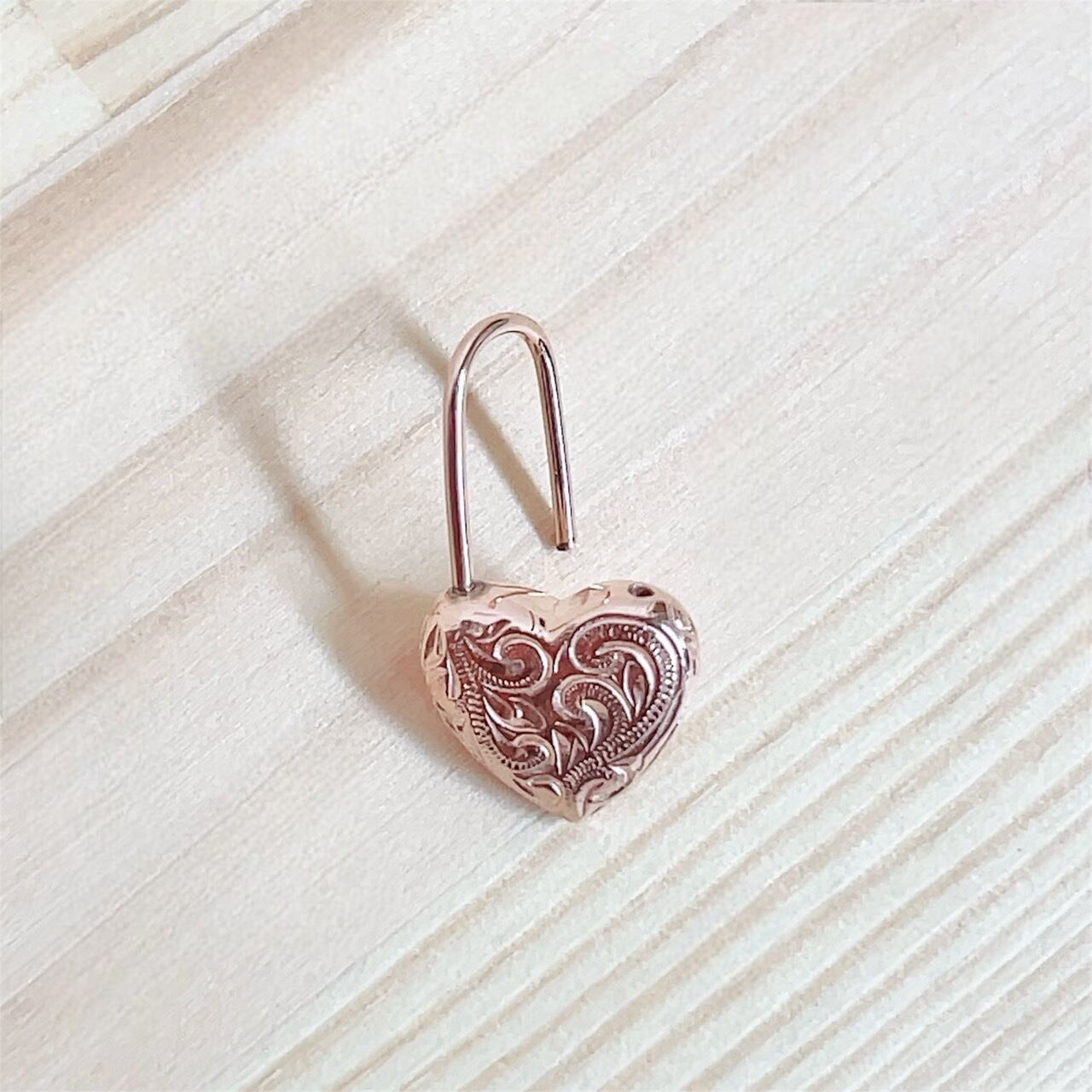 南京錠のハートモチーフが可愛いピアスです。ハワイ語で「ナル (Nalu)」と呼ばれる波モチーフが裏表にほどこされていて、ピンクゴールドの色味と他とは被らないデザインで厚みのあるハートがコロンっとしてとても可愛いです♡チェーンを通してペンダントトップとして身に着けることも可能です。