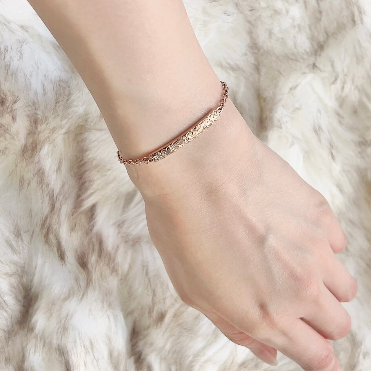 華奢なデザインで腕に馴染みやすく、どんなコーディネートにも合わせやすいアイテムです。