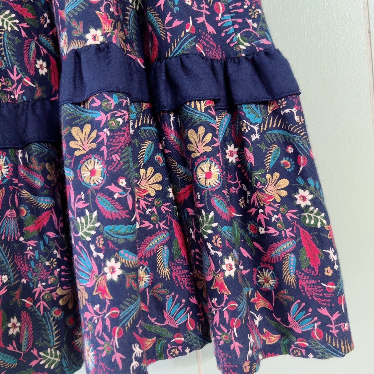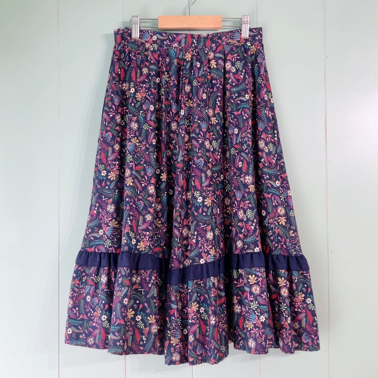 ネイビーに花柄のミディアム丈スカート。裾がフリルのようになっていてふわりとして可愛いですよ。レイヤードでも1枚で着ても素敵なアイテムです。