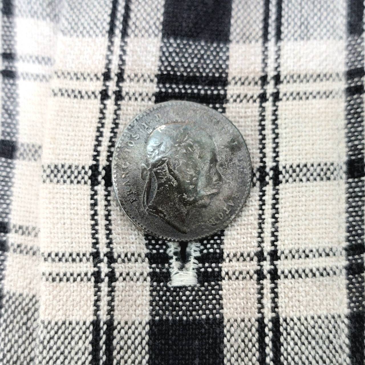 チェック柄と金属プレート・コイン風ボタンの装飾が珍しい