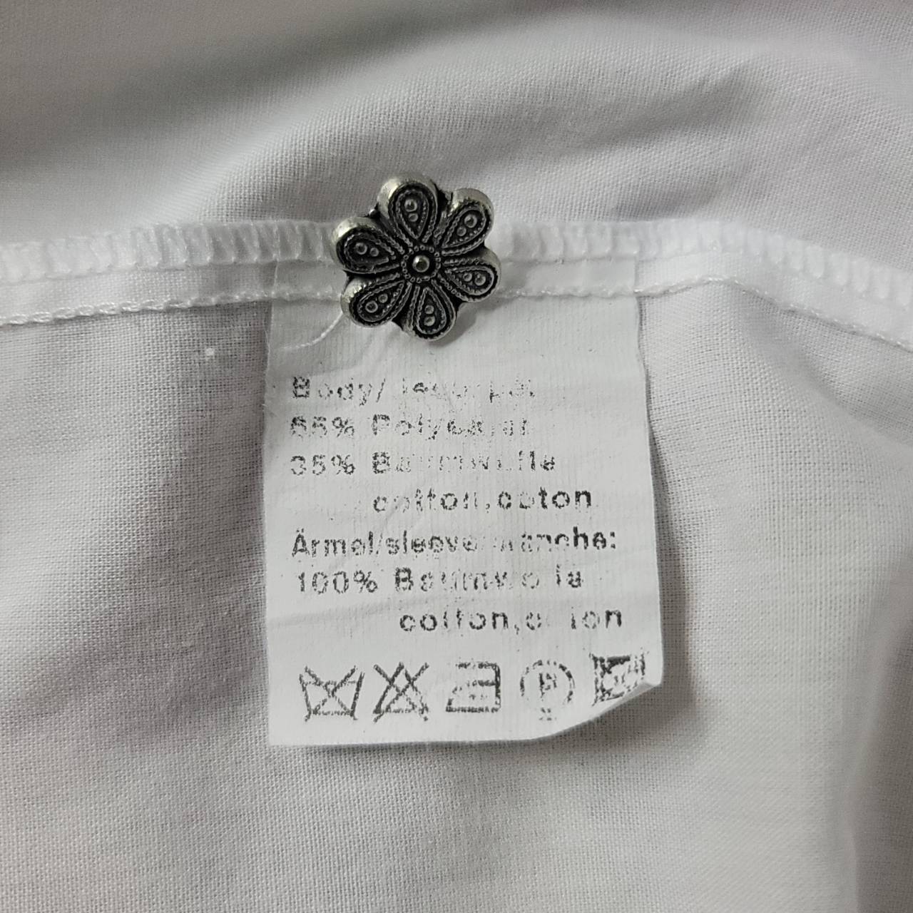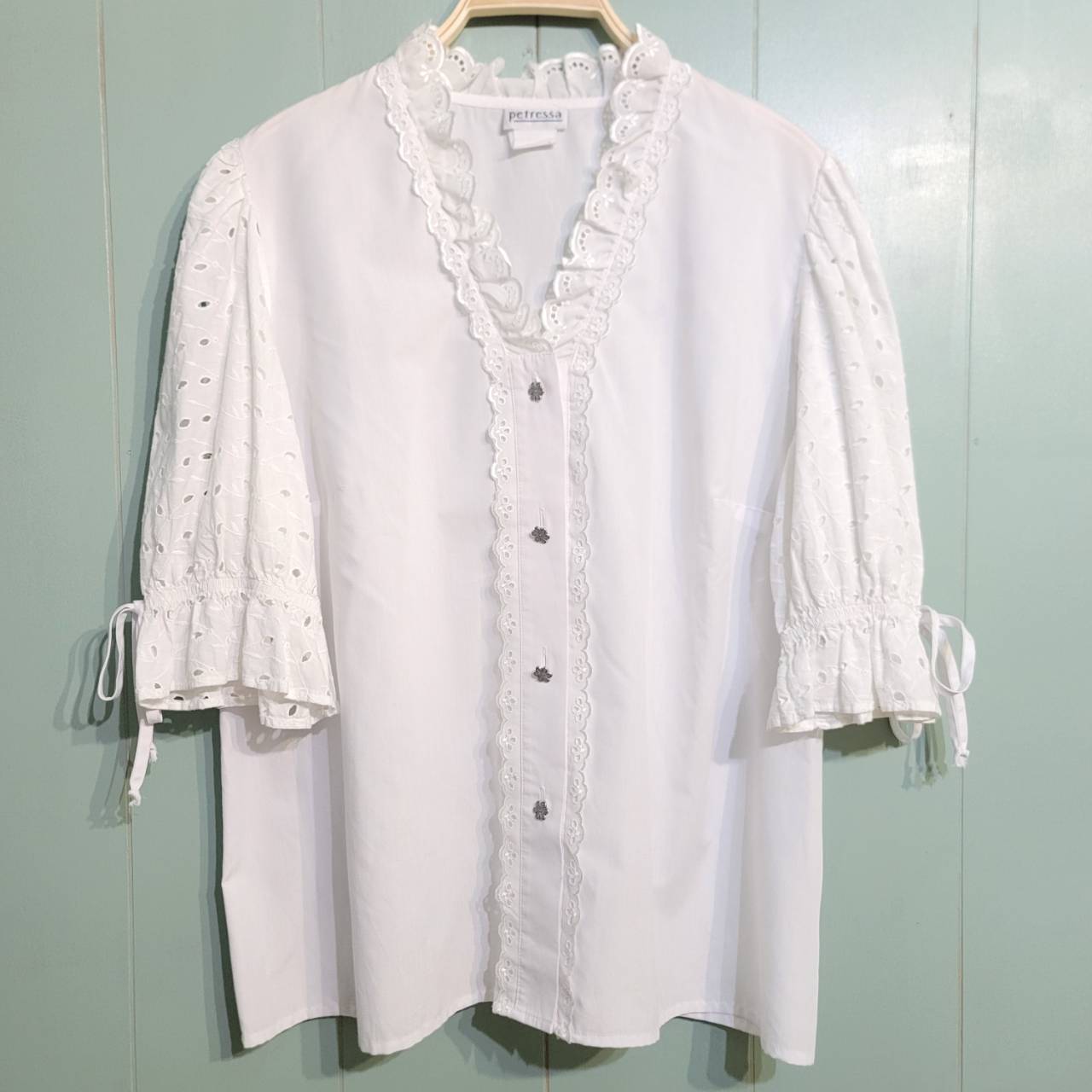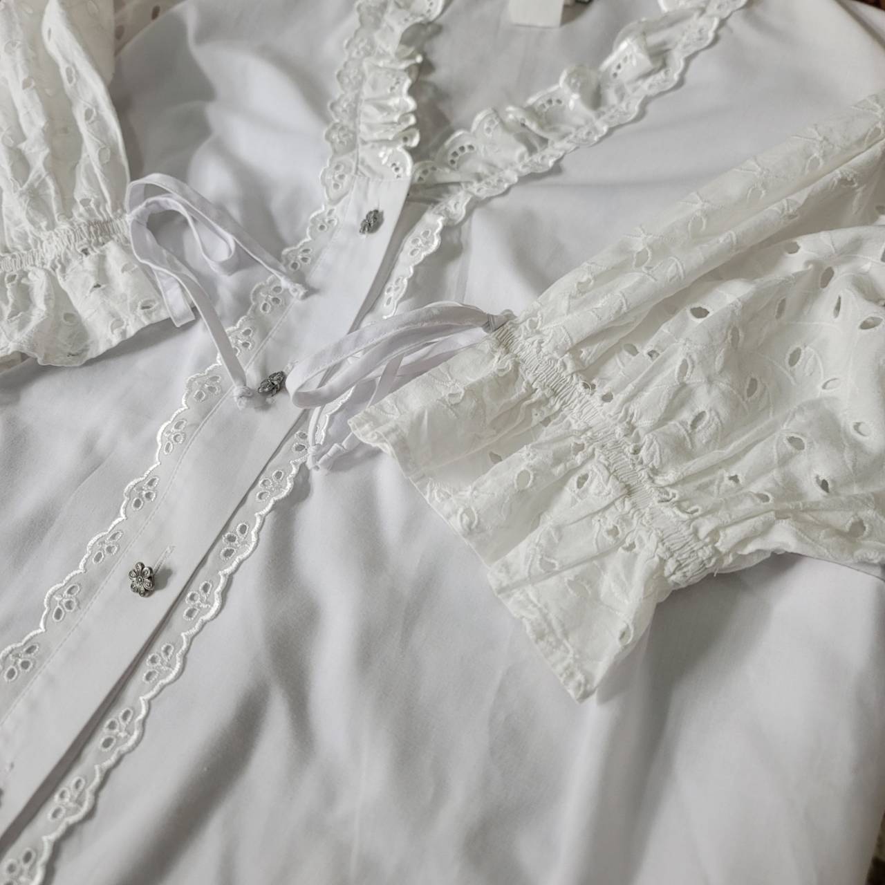 レースとパンチングとボタンがおしゃれなブラウスです。