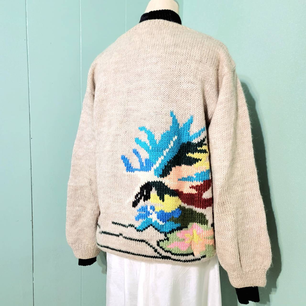前後に大胆にカラフルな植物柄が描かれた