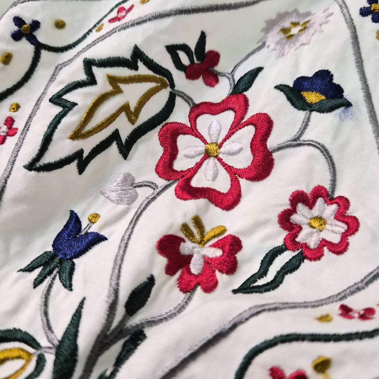 袖のカラフルな花柄刺繍と